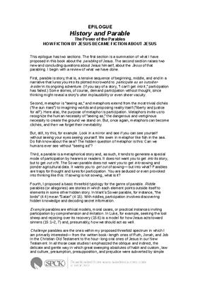 First, parable is story, that is, a tensive sequence of beginning, middle, and end in a narrative that lures you into its plotted microworld to participate as an outsider- insider in its ongoing adventure. (If you say of a story, “I can’t get into it,” participation has failed.) Some stories, of course, demand participation without thought, since thinking might reveal a story’s utter implausibility or even sheer vacuity.