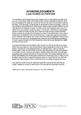 The translation at the beginning of each chapter (and in other biblical quotations) is my own. I have stuck closer to the Hebrew than modern translations often do when they are designed for reading in church so that you can see more precisely what the text says. Thus although I myself prefer to use gender-inclusive language, I have let the translation stay gendered if inclusivizing it would make it unclear whether the text was talking in the singular or plural—in other words, the translation often uses “he” where in my own writing I would say “they” or “he or she.” Sometimes I have added words to make the meaning clear, and I have put these words in square brackets. Space confines do not allow for including the whole of the biblical text in this volume; where there is insufficient room for the entire text, I make some general comments on the material I have had to omit. At the end of the book is a glossary of some terms that recur in the text (such as geographical, historical, and theological expressions). In each chapter (though not in the introduction) these terms are highlighted in bold the first time they occur...