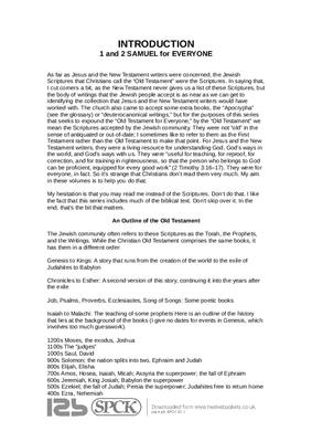 As far as Jesus and the New Testament writers were concerned, the Jewish Scriptures that Christians call the “Old Testament” were the Scriptures. In saying that, I cut corners a bit, as the New Testament never gives us a list of these Scriptures, but the body of writings that the Jewish people accept is as near as we can get to identifying the collection that Jesus and the New Testament writers would have worked with. The church also came to accept some extra books, the “Apocrypha” (see the glossary) or “deuterocanonical writings,” but for the purposes of this series that seeks to expound the “Old Testament for Everyone,” by the “Old Testament” we mean the Scriptures accepted by the Jewish community. They were not “old” in the sense of antiquated or out-of-date; I sometimes like to refer to them as the First Testament rather than the Old Testament to make that point. For Jesus and the New Testament writers, they were a living resource for understanding God, God’s ways in the world, and God’s ways with us. They were “useful for teaching, for reproof, for correction, and for training in righteousness, so that the person who belongs to God can be proficient, equipped for every good work” (2 Timothy 3:16–17). They were for everyone, in fact. So it’s strange that Christians don’t read them very much. My aim in these volumes is to help you do that...