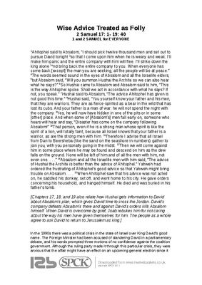 In the 1990s there was a political crisis in the state of Israel over King David’s good name. The Foreign Minister had been accused of slandering David in a parliamentary debate, and his words prompted three motions of no confidence against the coalition government. Although the ruling party made it through this particular crisis, they were anxious that the affair might have an effect on an upcoming general election since it might unite the whole religious community against the party. The chairman of the coalition called on the Foreign Minister to make a public apology, but he was unwilling to do so, though he had said that he did not intend to denigrate King David by remarks he had made about his relationship with Bathsheba. His actual words were, “Not everything that King David did, on the ground, on the rooftops, is acceptable to a Jew or is something I like.”...