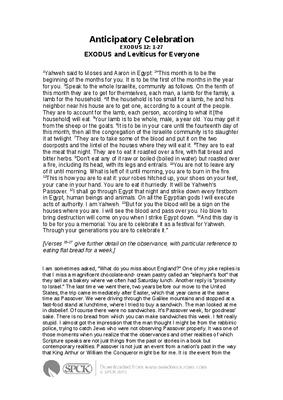 I am sometimes asked, “What do you miss about England?” One of my joke replies is that I miss a magnificent chocolate-and- cream pastry called an “elephant’s foot” that they sell at a bakery where we often had Saturday lunch. Another reply is “proximity to Israel.” The last time we went there, two years before our move to the United States, the trip came immediately after Easter, which that year came at the same time as Passover. We were driving through the Galilee mountains and stopped at a fast-food stand at lunchtime, where I tried to buy a sandwich. The man looked at me in disbelief. Of course there were no sandwiches. It’s Passover week, for goodness’ sake. There is no bread from which you can make sandwiches this week. I felt really stupid. I almost got the impression that the man thought I might be from the rabbinic police, trying to catch Jews who were not observing Passover properly. It was one of those moments when you realize that the observances and other realities of which Scripture speaks are not just things from the past or stories in a book but contemporary realities. Passover is not just an event from a nation’s past in the way that King Arthur or William the Conqueror might be for me. It is the event from the past that shapes the present for Jewish people...
