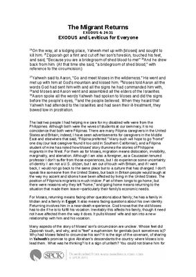 The last two people I had helping me care for my disabled wife were from the Philippines. Although both were the wives of students at our seminary, it is no coincidence that both were Filipinas. There are many Filipina caregivers in the United States and Britain; indeed, I have seen advertisements for caregivers in the Middle East and elsewhere that said, “Filipina preferred.” Many such will hope to go “home” one day (our last caregiver found it too cold in Southern California!), and a Filipina student of mine has noted how Moses’ story illumines the stories of Philippine migrants in the West. For them as for Moses, migration means dislocation, invisibility, marginality, and alienation. Although I am also a foreigner, as a Caucasian tenured professor I don’t suffer from those experiences, but I do experience some uncertainty of identity. I am not a U.S. citizen, but I am out of touch with Britain, and if I went back, I would not go back to the same place but to a culture that has changed. I don’t speak like someone from the United States, but back in Britain people would laugh at the way my accent and idioms have been affected by living in the United States. The position of Filipino/a migrants is much trickier. Part of them longs to go home; but there were reasons why they left “home,” and going home means returning to the situation that made them leave—particularly their family’s economic needs...