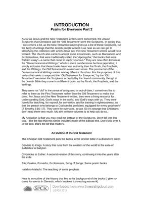 As far as Jesus and the New Testament writers were concerned, the Jewish Scriptures that Christians call the “Old Testament” were the Scriptures. In saying that, I cut corners a bit, as the New Testament never gives us a list of these Scriptures, but the body of writings that the Jewish people accept is as near as we can get to identifying the collection with which Jesus and the New Testament writers would have worked. The church also came to accept some extra books, such as Maccabees and Ecclesiasticus, that were traditionally called the “Apocrypha,” the books that were “hidden away”—a name that came to imply “spurious.” They are now often known as the “Deuterocanonical Writings,” which is more cumbersome but less pejorative; it simply indicates that these books have less authority than the Torah, the Prophets, and the Writings, the Old Testament in a narrower sense. The precise list of the Deuterocanonical Writings varies among different churches. For the purposes of this series that seeks to expound the “Old Testament for Everyone,” by the “Old Testament” we mean the Scriptures accepted by the Jewish community, though in the Jewish Bible they come in a different order, as the Torah, the Prophets, and the Writings...