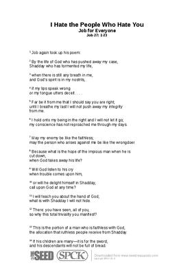 When I have taken part in “quiet days” for reflection and prayer, three favorite Old Testament texts have been the one about the still, small voice that I mentioned in connection with Job 25–26, the “Be still and know that I am God” of Psalm 46, and the reminder in Psalm 139 that wherever we go, God is there. But on other occasions I have been with people who have appreciated Psalm 139 and then discovered that it later talks about hating the people who hate God, and they are disturbed. How can someone who is so spiritually sensitive in the earlier part of the psalm talk about hating in the later part of the psalm?...
