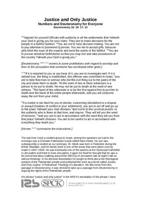 The last time I took a student group to Israel, among the speakers we had in the evenings was a Christian Palestinian Israeli called Naim Ateek; his son was subsequently a student at our seminary. Dr. Ateek was born in Palestine during the British Mandate, and his family lived in one of the areas that were taken over by Israel in 1947–1948. He was eventually one of the pastors at the Episcopal Cathedral in Jerusalem and lived in East Jerusalem; it gave me food for thought that he was a bit concerned about walking around the Old City of Jerusalem late at night (I did so without thinking). In his doctoral dissertation he sought to think about the theological position of the Palestinian people and published the work as a book called Justice, and Only Justice: A Palestinian Theology of Liberation. His title came from this passage in Deuteronomy; it was shrewd to take up a passage from Deuteronomy in arguing the rights of the Palestinian people...