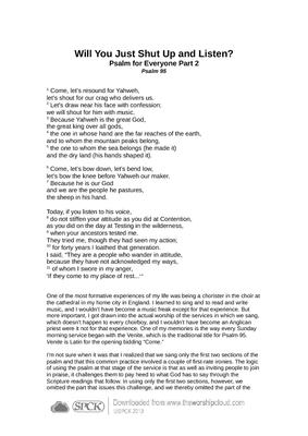 One of the most formative experiences of my life was being a chorister in the choir at the cathedral in my home city in England. I learned to sing and to read and write music, and I wouldn’t have become a music freak except for that experience. But more important, I got drawn into the actual worship of the services in which we sang, which doesn’t happen to every choirboy, and I wouldn’t have become an Anglican priest were it not for that experience. One of my memories is the way every Sunday morning service began with the Venite, which is the traditional title for Psalm 95. Venite is Latin for the opening bidding “Come.”...