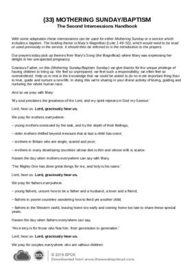 With some adaptation these intercessions can be used for either Mothering Sunday or a service which includes a baptism. The holding theme is Mary’s Magnificat (Luke 1.46–55), which would need to be read or used previously in the service. It should then be referred to in the introduction to the prayers…