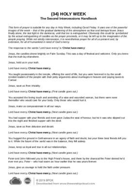 This form of prayer is suitable for any day in Holy Week, including Good Friday. It uses one of the powerful images of the week – that of the gradual darkening of the atmosphere as fear and betrayal leave Jesus finally alone, the last light in the darkness, until that too is extinguished. Obviously this could be symbolized by the actual extinguishing of candles as the prayer proceeds, or it may be left up to the imagination of the people praying. While not strictly intercession, it is nevertheless prayer for all of us present and, by extension, for all of humankind in need of God’s mercy…