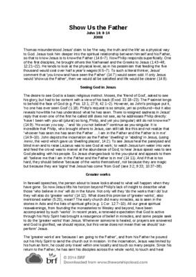 Thomas misunderstood Jesus’ claim to be ‘the way, the truth and the life’ as a physical way to God. Jesus took him deeper into the spiritual relationship between himself and his Father, so that to know Jesus is to know the Father (14:6–7)…