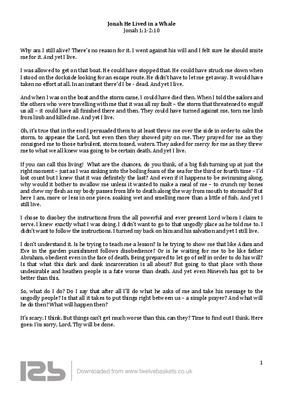 This is one of a number of monologues that I have written for use in worship or some other reflective purpose. This one deals with the events of Jonah 1:1- 2:10 from the point of view of Jonah.