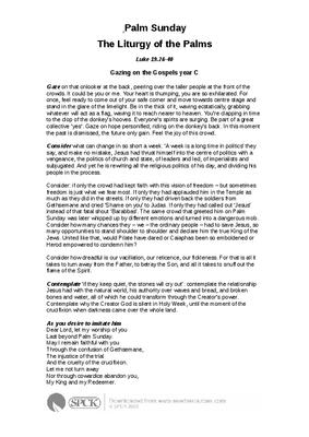 Gaze on that onlooker at the back, peering over the taller people at the front of the crowds. It could be you or me. Your heart is thumping, you are so exhilarated. For once, feel ready to come out of your safe corner and move towards centre stage and stand in the glare of the limelight. Be in the thick of it, waving ecstatically, grabbing whatever will act as a flag, waving it to reach nearer to heaven. You’re clapping in time to the clop of the donkey’s hooves. Everyone’s spirits are surging. Be part of a great collective ‘yes’. Gaze on hope personified, riding on the donkey’s back. In this moment the past is dismissed, the future only gain. Feel the joy of this crowd...