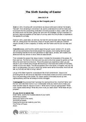 Gaze on John, frowning with concentration as Jesus continues to deliver his lengthy ‘farewell’. He is straining to remember it all, and to understand how all the twists and turns build into the overarching vindication of God’s purpose in Jesus. Listen with John as Jesus pours out his heart, going over and over his message, trying to express it in as many ways as possible so that each of us may catch the one phrase or explanation that speaks to us today...