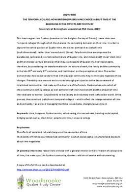 This thesis argues that Quakers (members of the Religious Society of Friends) create their own ‘temporal collages’ through which they balance the competing demands on their time. In order to capture the varied qualities of Quaker time, the author portrays it as ‘polychronic’ (multidimensional), rather than ‘monochronic’ (linear). Polychronic time encompasses the paradoxical, cyclical and interconnected nature of Quaker time, and includes both linear ‘clock time’ and the timeless spiritual dimension that imbues all aspects of Quaker life. The thesis begins, therefore, by considering the transformations in the nature of work, the family and the community in the late 20th and early 21st centuries, and their impact on the perception of time. The author demonstrates how social bonds formed in the Quaker community help its members negotiate these changes. Friendships are created and nurtured through participation in the dense network of interlinked communities that make up the structure of the Society. Quakers choose to which of these communities they belong, as well as the level of their involvement and the amount of time they dedicate to ‘service’ (unpaid work) to the Society and voluntary work in the wider world. In the process, they construct ‘polychronic temporal collages’ – which reflect the interpenetration of time and spirituality – as a way of managing their time in a complex, changing environment.