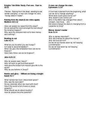 A Bible Study series based around themes from the film Knight's Tale. It includes a series of questions linked to a variety of verses aimed to provoke discussion and thought about a wide range of themes. This is the first part and runs from the start of the film until William says 'money doesn't matter'.
