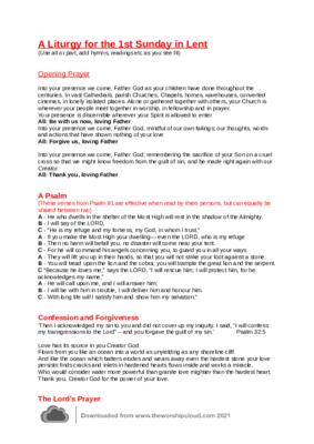 A liturgy for the first Sunday in Lent (or simply as part of the Lent season) with responsive prayer and a reading for up to 3 people. Love has its source in you Creator God Flows from you like an ocean into a world as unyielding as any shoreline cliff And like the ocean which batters erodes and wears away even the hardest stone your love persists............