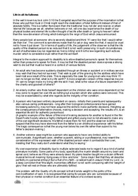 Many people look at someone who is severely disabled and think 'if I were like that I would rather die than live'. The comment is sometimes made that if a cat or dog were like that, it would be cruel not to 'have it put down.' So in terms of quality of life, the judgement of the observer is that the life quality of the disabled person is so reduced that it is not worth preserving. In such circumstances an act of euthanasia may be regarded as 'mercy killing' and it is the law regarding such acts as murder which is considered cruel rather than the act itself.