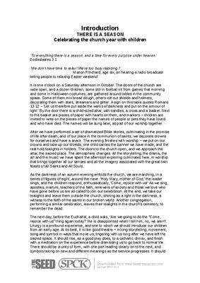 ‘We don’t have time to relax! We’re too busy rejoicing !’ Marion Pritchard, age six, on hearing a radio broadcast telling people to relaxing Easter weekend’ It is one o’clock on a Saturday afternoon in October. The doors of the church are wide open, and a dozen children, some still in football kit from games that morning and some in Halloween costumes, are gathered around tables in the community space. Some of them mix bread dough, others cut out shields and helmets, decorating them with stars, streamers and glitter. A sign on this table quotes Romans 13.12 – ‘Let us therefore put aside the works of darkness and put on the armour of light.’ By the door there is a child-sized altar, with candles, a cross and a basket. Next to the basket are pieces of paper with hearts on them, and markers – children are invited to write on the pieces of paper the names of people or pets they have loved and who have died. The names will be sung later, as part of our worship together...