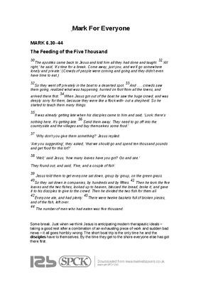 We can guess the disciples’ reaction. But they couldn’t have guessed what Jesus would say, or what he would do next. In retrospect, they realized that his primary feeling when faced with this great crowd, so eager for something even though they didn’t know what, was deep human compassion. He was sorry for them. And – this is Mark’s comment, reflecting the growing post-Easter awareness of what had been in Jesus’ mind – he saw them as leaderless, kingless folk. ‘Sheep without a shepherd’ is a regular biblical way of describing the people of Israel when they have no leader, no king (Numbers 27.17; 1 Kings 22.17; Ezekiel 34.5; Zechariah 10.2)...