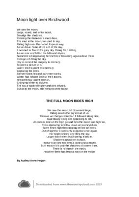 Moonlight over Birchwood is a descriptive poem about an actual event of driving along Birchwood way and following the moon with my eyes as my husband drove. The moon appeared to travel along with us as it were some times disappearing from view then appearing again above the trees. By Audrey Hogan