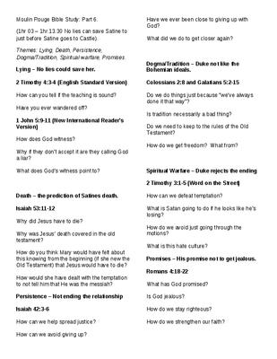 A Bible Study which relies heavily on discussion rather than leading. Using the film 'Moulin Rouge' as a starting point and then looking at a variety of passages (which can be obtained from the web in a variety of different translations) There are questions to help start discussion - some are harder than others.
