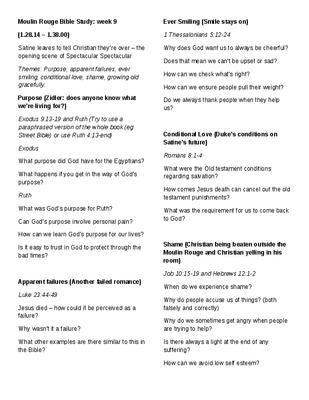A Bible Study which relies heavily on discussion rather than leading. Using the film 'Moulin Rouge' as a starting point and then looking at a variety of passages (which can be obtained from the web in a variety of different translations) There are questions to help start discussion - some are harder than others.
