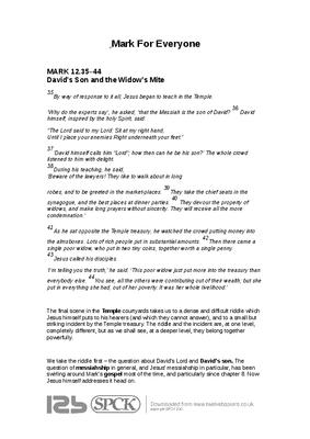 ...The final scene in the Temple courtyards takes us to a dense and difficult riddle which Jesus himself puts to his hearers (and which they cannot answer), and to a small but striking incident by the Temple treasury. The riddle and the incident are, at one level, completely different, but as we shall see, at a deeper level, they belong together powerfully.