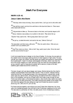This tale, though, isn’t just about danger and rescue. Behind stories like this, Mark’s readers would probably have heard older echoes. Think of Jonah. Instead of doing what God told him, he was sailing away in the wrong direction; a great storm arose, which was only calmed when, at his prompting, the sailors threw him overboard. Or think of the Israelites, coming out of Egypt when God made a way through the sea. Think even further back, to the stories of creation, when God’s order, God’s new world, emerged from the dark primal sea. The Psalms several times speak of the creator God who rules the raging of the sea, telling its rough and threatening waves to quieten down (e.g. 65.7; 89.9; 93.3–4; 107.23–30)...