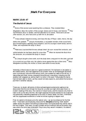 There are, no doubt, still plenty of other archaeological excitements waiting to be discovered. But this one brings into focus for us what we might otherwise miss in a modern reading of the story: the manner of Jesus’ burial, and the reasons why Mark is keen to tell us the story like this. We might suppose the burial narrative to be a sad and not particularly interesting appendix to the story of Jesus’ death; for Mark, it trembles with the suppressed excitement of what he knows is going to happen next...
