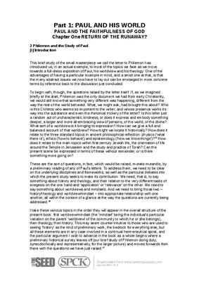This brief study of the small masterpiece we call the letter to Philemon has introduced us, in an actual example, to most of the topics we face as we move towards a full-dress exposition of Paul, his worldview and his theology. One of the advantages of having a particular example in mind, and a small one at that, is that the many abstract issues we now have to lay out can be envisaged in more concrete terms by reference back to the discussion just concluded...