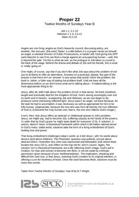 Angels are one thing; angels as God’s heavenly council, discussing policy, are another; ‘the Accuser’ (the word ‘Satan’ is a title before it is a proper name) as himself an angel, a celestial Director of Public Prosecutions, is harder still; God giving this DPP carte blanche to see if he can find a charge against an unsuspecting human – well, this is beyond the pale. Yet this is what we see, as the prologue to Job takes us round to the back of the stage. Behind the drama and debate of Job and his friends, this is what is ‘really’ going on...