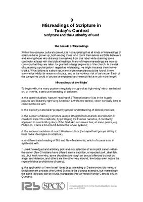 Within this complex cultural context, it is not surprising that all kinds of misreadings of scripture have grown up, both among those who count themselves as Bible-believers and among those who distance themselves from that label while claiming some continuity at least with the biblical tradition. Many of these misreadings are now so common that they are taken for granted in large segments of the church. At the risk of sustaining a polarization I regard as misleading, we might instance them in two blocks. What follows is a short list; many more examples could be found. I here summarize wildly for reasons of space, and at the obvious risk of caricature. Each of the categories could of course be explained and exemplified at much more length...