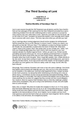 Just in case anyone thought the Old Testament was all gloomy and the New cheerful, here are two passages of dire warning from the New Testament preceded by a warm, redeeming invitation from the Old. Underlying both is God’s summons to accept his mercy and his way now, while there is time: ‘Seek the Lord while he may be found, call on him while he is near.’ Unstated, but powerfully implied, is the message which Isaiah has in common with Luke’s Jesus. ‘The time may come when you will wish you had.’...