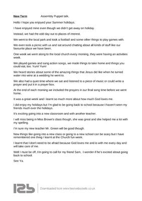 This is a puppet sketch for use in Assembly the first term back after the summer holidays.