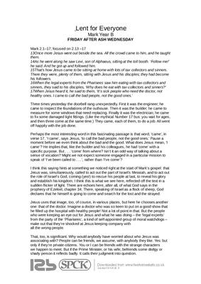 Perhaps the most interesting word in this fascinating passage is that word, ‘came’, in verse 17. ‘I came’, says Jesus, ‘to call the bad people, not the good ones.’ Pause a moment before we even think about the bad and the good. What does Jesus mean, ‘I came’? He implies that, like the builder and his colleagues, he had ‘come’ with a specific purpose...