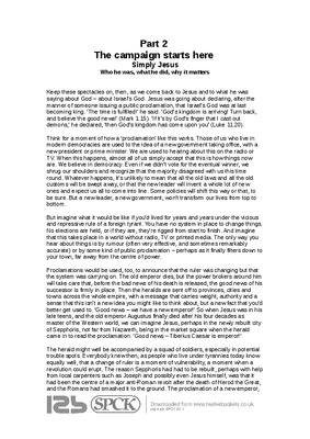 Keep these spectacles on, then, as we come back to Jesus and to what he was saying about God – about Israel’s God. Jesus was going about declaring, after the manner of someone issuing a public proclamation, that Israel’s God was at last becoming king. ‘The time is fulfilled!’ he said. ‘God’s kingdom is arriving! Turn back, and believe the good news!’ (Mark 1.15). ‘If it’s by God’s finger that I cast out demons,’ he declared, ‘then God’s kingdom has come upon you’ (Luke 11.20)...