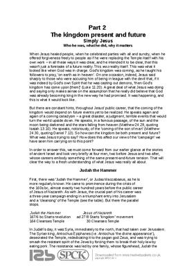 When Jesus healed people, when he celebrated parties with all and sundry, when he offered forgiveness freely to people as if he were replacing the Temple itself with his own work – in all these ways it was clear, and he intended it to be clear, that this wasn’t just a foretaste of a future reality. This was reality itself. This was what it looked like when God was in charge. God’s kingdom was coming, as he taught his followers to pray, ‘on earth as in heaven’. On one occasion, indeed, Jesus said sharply to those who were accusing him of being in league with the devil that, if it was indeed by God’s own Spirit that he was casting out demons, ‘then God’s kingdom has come upon [them]’ (Luke 11.20). A great deal of what Jesus was doing and saying only makes sense on the assumption that he really did believe that God was already becoming king in the new way he had promised. It was happening, and this is what it would look like...