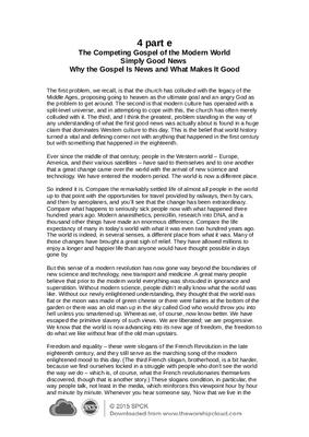 The first problem, we recall, is that the church has colluded with the legacy of the Middle Ages, proposing going to heaven as the ultimate goal and an angry God as the problem to get around. The second is that modern culture has operated with a split-level universe, and in attempting to cope with this, the church has often merely colluded with it. The third, and I think the greatest, problem standing in the way of any understanding of what the first good news was actually about is found in a huge claim that dominates Western culture to this day. This is the belief that world history turned a vital and defining corner not with anything that happened in the first century but with something that happened in the eighteenth…