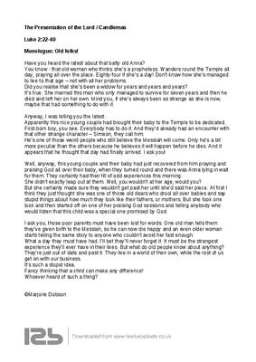 You know - that old woman who thinks she’s a prophetess. Wanders round the Temple all day, praying all over the place. Eighty-four if she’s a day! Don’t know how she’s managed to live to that age – not with all her problems.