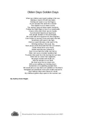 Olden Golden Days is a poem about looking back to those early days of my childhood. Nostalgic but with thankfulness for God's goodness to me all of my life.