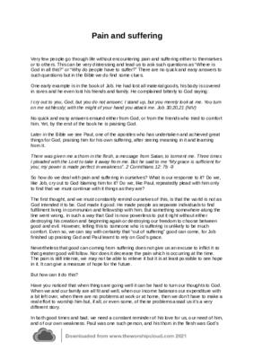 In this brief (1377 words) reflection/sermon some of the positive outcomes of suffering and pain are highlighted, without minimising their effects upon those concerned.