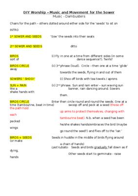 The 'script' may be difficult to follow, but it's telling the parable by way of movement set to the 'Dambusters' film music. We also used a few simple 'props' such as beaks for the birds.