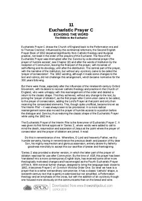 Eucharistic Prayer C draws the Church of England back to the Reformation era and to Thomas Cranmer. Influenced by the continental reformers, the Second English Prayer Book of 1552 departed significantly from Catholic theology and liturgical practice, not least in the order of the prayers of the Eucharist. The flow of the Eucharistic Prayer was interrupted after the Sanctus by a devotional prayer (‘the prayer of humble access’, see Chapter 18) and after the words of institution by the reception of Communion, leaving the final part of the prayer, with its sense of self-offering and its doxology, until after the distribution. The central part of the prayer, with the narrative of the institution, but without any epiclesis, came to be called the ‘prayer of consecration’. The 1662 wording, although it made some changes to the text and rubrics, did not challenge this arrangement, which became normative for the 300 years following…