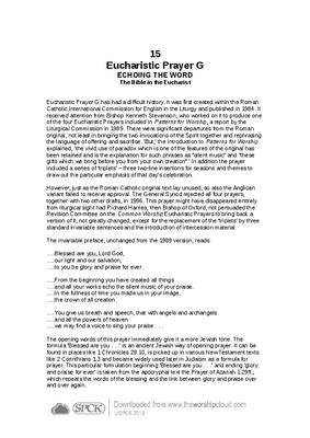 Eucharistic Prayer G has had a difficult history. It was first created within the Roman Catholic International Commission for English in the Liturgy and published in 1984. It received attention from Bishop Kenneth Stevenson, who worked on it to produce one of the four Eucharistic Prayers included in Patterns for Worship, a report by the Liturgical Commission in 1989. There were significant departures from the Roman original, not least in bringing the two invocations of the Spirit together and rephrasing the language of offering and sacrifice. ‘But,’ the Introduction to Patterns for Worship explained, ‘the vivid use of paradox which is one of the features of the original has been retained and is the explanation for such phrases as “silent music” and “these gifts which we bring before you from your own creation”.’ In addition the prayer included a series of ‘triplets’ – three two-line insertions for seasons and themes to draw out the particular emphasis of that day’s celebration…