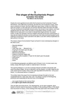 Clearly the most significant texts within the Eucharist are the Eucharistic Prayers themselves. Until 1980 each eucharistic rite had only one Eucharistic Prayer; there was no element of choice. But from 1980 there was choice. In Rite A of ASB there were four prayers. In the main text of Common Worship Order One there are eight. This has introduced considerable textual variety. But except in two matters, one more significant than the other, there has been no equivalent variety of shape. So it is helpful at this early point in our book to indicate that shape and then, to a great extent, to take it for granted in the ten chapters that look at the texts of the prayers. It may also be helpful to introduce at this point just a few fairly technical liturgical words relating to Eucharistic Prayers and then to be able to use them without explanation at later points in the book…