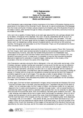 John Damascene was a personage of prime importance in the history of Byzantine theology and a great doctor in the history of the universal Church. Above all, he was an eyewitness of the passage from the Greek and Syrian Christian cultures shared by the Eastern part of the Byzantine Empire to the Islamic culture, which spread through its military conquests in the territory commonly known as the Middle or Near East…