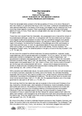Peter the Venerable takes us back to the famous abbey of Cluny, to its decor (“decorum”) and nitor (“clarity”), to use terms that recur in the Cluny texts - a decorum and splendour that were admired especially in the beauty of the liturgy, a privileged way for reaching God. Even more than these aspects, however, Peter’s personality recalls the holiness of the great abbots of Cluny, in Cluny, “there was not a single abbot who was not a saint,” Pope Gregory VII said in 1080…