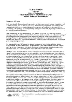 I talk now about St. Bonaventure of Bagnoregio. I confide to you that in broaching this subject I feel a certain nostalgia, for I am thinking back to my research as a young scholar on this author, who was particularly dear to me. My knowledge of him had quite an impact on my formation. A few months ago, with great joy, I made a pilgrimage to the place of his birth, Bagnoregio, an Italian town in Lazio that venerates his memory…
