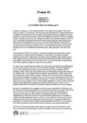 Whatever is going on in this strange parable of the dishonest manager? Whichever way you read it, it is confusing. Luke has obviously decided that it is about attachment to wealth, and he has put it with a couple of other stories about the dangers of money, and stuck in Luke 6.16–18 as well, which just heightens the sense of this as a ragbag chapter. You get a picture of Luke, sitting at his desk with a bundle of papers in front of him. He has got the overall structure of his book sorted, and he knows where all the main stories and sayings fit, but now he is left with his file labelled ‘miscellaneous’. ‘What do I do with these?’ he asks himself. ‘The old chap who told me the story said he’d been there when Jesus had told it. But I can’t help thinking that he must have missed some of it, or wandered off before the end. Jesus just can’t have told it like this.’...