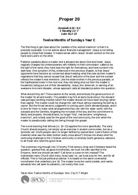 The first thing to get clear about the ‘parable of the wicked mammon’ is that it is precisely a parable. It is not advice about financial management: Jesus is not telling people to cheat their bosses. It makes sense within Jesus’ Jewish context on the one hand and Luke’s on the other.