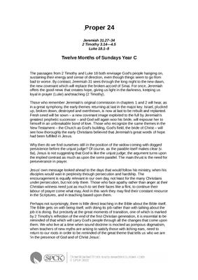 The passages from 2 Timothy and Luke 18 both envisage God’s people hanging on, sustaining their energy and sense of direction, even though things seem to go from bad to worse. By contrast, Jeremiah 31 sees through the long night to the new dawn, the new covenant which will replace the broken accord of Sinai. For once, Jeremiah offers the good news that creates hope, giving us light in the darkness, keeping us loyal in prayer (Luke) and teaching (2 Timothy)...